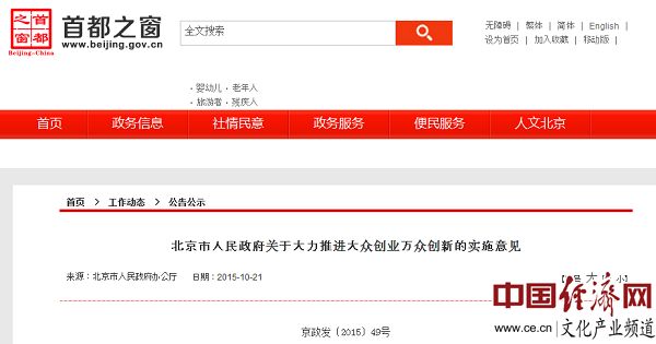 中國經濟網北京11月19日訊 北京市人民政府網站消息,10月19日,北京市人民政府發布了《北京市人民政府關于大力推進大眾創業萬眾創新的實施意見》。此意見為深入貫徹落實《國務院關于大力推進大眾創業萬眾創新若干政策措施的意見》(國發〔2015〕32號)和《國務院辦公廳關于發展眾創空間推進大眾創新創業的指導意見》(國辦發〔2015〕9號)等文件精神,適應和引領經濟發展新常態,以創新帶動創業,有效激發全社會創新潛能和創業活力,特提出實施意見。