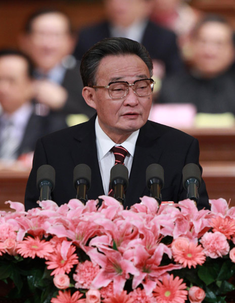 Wu Bangguo, chairman of the Standing Committee of the National People's Congress (NPC), delivers a work report of the Standing Committee of the NPC during the second plenary meeting of the Fourth Session of the 11th NPC at the Great Hall of the People in Beijing, capital of China, March 10, 2011. (Xinhua/Pang Xinglei)