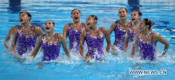 Team China perform during the women's synchronised swimming team free routine final at the 16th Asian Games in Foshan, south China's Guangdong Province, Nov. 20, 2010. China claimed the title with 192.000 points. (Xinhua/Fei Maohua)