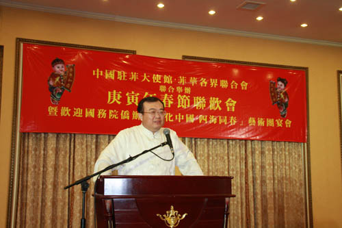 當天晚上,中國駐菲律賓大使館和菲華各界聯合會舉辦盛大的聯歡晚宴,歡迎藝術團的到來。菲華各界聯合會主席戴宏達、中國駐菲律賓大使劉建超、藝術團團長熊昌良分別發表熱情洋溢的致辭。在致辭中,戴宏達主席和劉建超大使對國務院僑辦組派如此高水準的藝術團來菲演出表示感謝,各位藝術家放棄在春節與家人團聚的機會,千里迢迢赴海外慰問僑胞,用歡快的歌聲和舞蹈為海外僑社增添了喜慶的春節氣氛。全體旅菲僑胞將翹首期盼藝術團的演出取得圓滿成功。