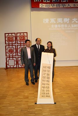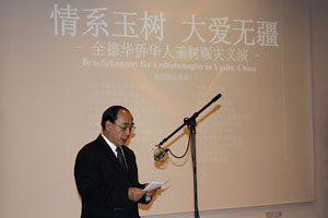 2010年4月27日晚,全德華僑華人聯(lián)合總會、全德華人社團聯(lián)合會、旅德華僑華人中國和平統(tǒng)一促進會、柏林中國婦女聯(lián)誼會等20多個僑團以及中國留德學生學者聯(lián)合會等在柏林中國文化中心舉辦“情系玉樹、大愛無疆——全德華僑華人玉樹賑災(zāi)義演”活動。中國駐德國大使吳紅波、領(lǐng)事部主任湯文娟參贊以及旅德華僑華人、留學生代表200余人出席。演出開始前,播放了玉樹地震受災(zāi)以及救援人員奮勇抗災(zāi)記錄短片,之后全體人員肅立默哀1分鐘,深切悼念在玉樹地震中不幸遇難的同胞。