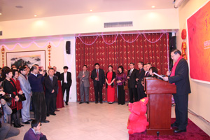 6點(diǎn)30分,招待會在歡快的樂曲聲中開始。張大使首先向參加招待會的所有來賓拜年,并委托他們向各自家人和其他華人朋友轉(zhuǎn)達(dá)新春祝福。他說,2010年,全國各族人民在黨中央、國務(wù)院的領(lǐng)導(dǎo)下,不斷取得驕人業(yè)績,綜合國力又有了明顯提升,已成為世界第二大經(jīng)濟(jì)體;通過抗擊自然災(zāi)害,成功舉辦上海世博會和廣州亞運(yùn)會,并沉著應(yīng)對復(fù)雜的國際形勢,中國向世界展示了一個堅定自信、開放包容、進(jìn)步友好的大國形象。2010年也是中比關(guān)系的豐收年,兩國在政治、經(jīng)貿(mào)、文化、教育、科技以及其他領(lǐng)域的交流和合作取得新的進(jìn)展。張大使指出,廣大旅比僑胞在積極融入當(dāng)?shù)厣鐣耐瑫r不忘故土,當(dāng)國內(nèi)發(fā)生自然災(zāi)害時,紛紛伸出援手,對貧困地區(qū)的人民慷慨解囊,令人感動,他再次代表使館表示感謝。張大使還介紹了不久前胡錦濤主席對美國進(jìn)行的國事訪問,指出在這次影響深遠(yuǎn)、成果豐碩的國事訪問中,雙方全面規(guī)劃了今后一個時期發(fā)展關(guān)系的重點(diǎn)方向和深化合作的重點(diǎn)領(lǐng)域,確認(rèn)雙方共同努力,建設(shè)相互尊重、互利共贏的合作伙伴關(guān)系。張大使表示,2011年是中國十二五規(guī)劃的開局之年,同時也將迎來中比建交40周年,他呼吁大家以更加扎實(shí)的努力,實(shí)現(xiàn)中比友好合作關(guān)系躍上新臺階。