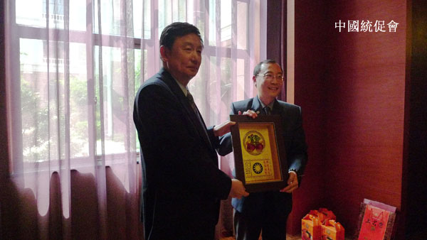 互贈紀念品,右為訪問團團長張振偉先生、左為中國統促會副秘書長王安南