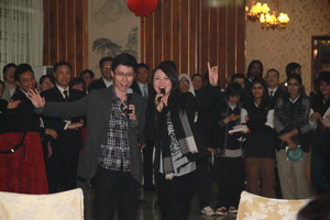 正式活動之前,百人青年團(tuán)成員參觀了使館大院,并與使館青年外交官進(jìn)行了球類比賽、棋牌游戲、卡拉OK等豐富多彩的文體活動,使館到處充滿了歡聲笑語。聯(lián)誼會上,青年團(tuán)員和使館館員先后登臺,聯(lián)袂獻(xiàn)上了精彩的文藝節(jié)目,將整個聯(lián)歡活動推向了高潮。 |