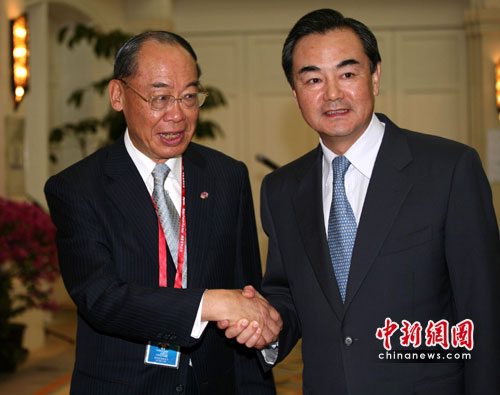 中共中央臺辦、國務院臺辦主任王毅4月10日在海南博鰲為前來出席博鰲亞洲論壇2010年年會的臺灣兩岸共同市場基金會最高顧問錢復一行舉辦招待酒會。中新社發 王辛莉 攝