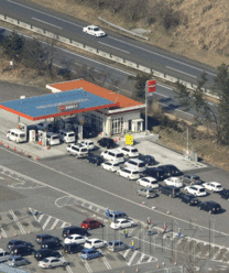 長(zhǎng)者原服務(wù)區(qū)(位于宮城縣大崎市)的加油站內(nèi),等待加油的汽車排成了1公里以上的長(zhǎng)隊(duì)。大崎市的山下智美(19歲)高興地表示,“聽說服務(wù)區(qū)能優(yōu)先供應(yīng)汽油,所以一直期待早日開放。”