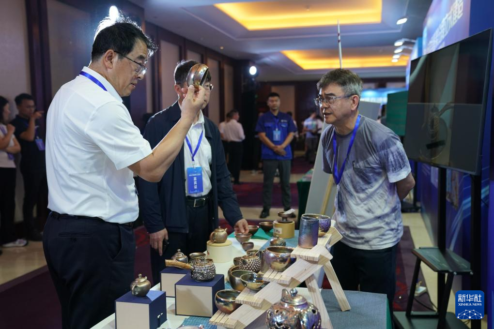 6月15日,在2025海峽職工論壇傳統工藝非遺產品展示區的柴燒窯(臺灣)展位,參會人員與柴燒陶藝傳承人吳重毅老師(右一)交流。新華社發(王鑫攝)