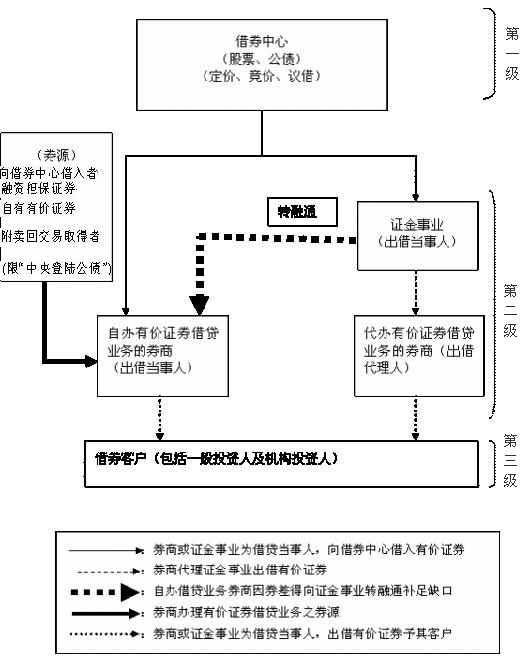 隨著證券市場與證券衍生商品市場發展,臺灣信用交易制度及后來推出的以交割為需求的借券制度,已經無法滿足法人機構的中性借券需求。為順應需求,配合證券及其衍生性市場發展,臺灣證交所于1996年9月實施“臺灣證交所有價證券借貸辦法”,正式推出有價證券借貸制度,以證交所為中介人開辦集中式有價證券借貸業務,特定機構法人為參加人,出借人與借券人可以通過券商向證交所申請以定價、競價或議借交易方式借入有價證券,出借人可賺取出借收益,借券人則可滿足其套利、避險交易及履約等策略性操作的需求。營業時間是星期一至星期五每日上午9時至下午2時30分,還券作業則至下午3時,與集中交易市場營業時間相同。證券柜臺買賣中心也于2000年9月推出交割所需的證券借貸制度。2003年6月30日臺灣又推出“策略性交易借券制度”。2006年1月11日臺灣當局公布“證券交易法”第60條修正條文,開放券商經主管機關核準后可從事有價證券借貸的代理。臺灣“金融監督管理委員會”2006年8月11日發布“券商辦理有價證券借貸管理辦法”,確立證交所借券系統、券商營業處所經營有價證券借貸業務可以并存,由券商以當事人身分出借有價證券給客戶,并使有價證券借貸業務與信用交易券源得以互通,放寬了信用交易“以資養券”的規定,即融資擔保證券可供融券及出借券源,而借入證券則可充為融券券源,以增進有價證券的運用效率,同時盡可能維持有價證券借貸交易與信用交易的現行法律架構不變,以減輕對市場的沖擊。至此,券商辦理證券借貸業務的關系架構分三級:第一級為證交所及柜買中心及公債借券中心,第二級為自辦有價證券借貸業務的券商及對券商辦理借券轉融通的證金公司,第三級為借券客戶。