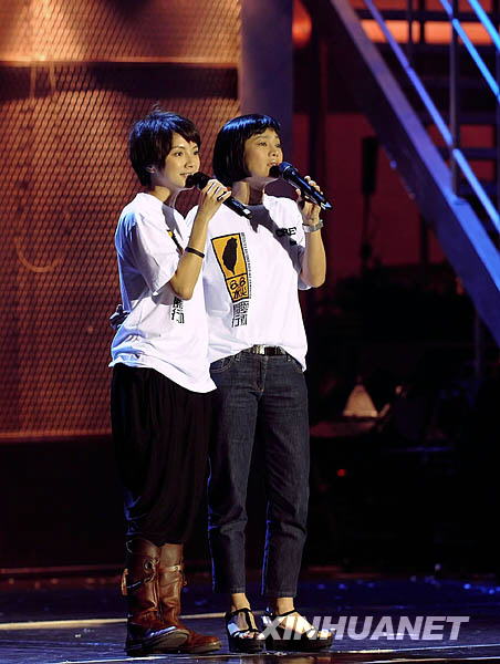 8月17日,在香港舉行的賑災義演中,香港藝人李心潔(左)和臺灣藝人張艾嘉演唱《愛的代價》。新華社記者陳鐸攝