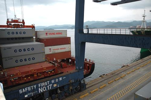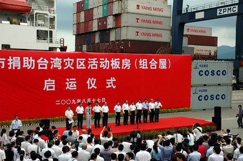 8月17日,深圳捐助臺灣災區(qū)物資啟運儀式在深圳鹽田港舉行。當日,深圳捐助給臺灣災區(qū)的首批100套活動板房從深圳鹽田港啟運。臺風“莫拉克”使臺灣遭受50年來最嚴重的水災,為幫助受災的臺灣中南部地區(qū),深圳市委、市政府日前決定向臺灣災區(qū)捐贈1000套活動板房,總價值近2000萬元。新華社記者 吳俊 攝