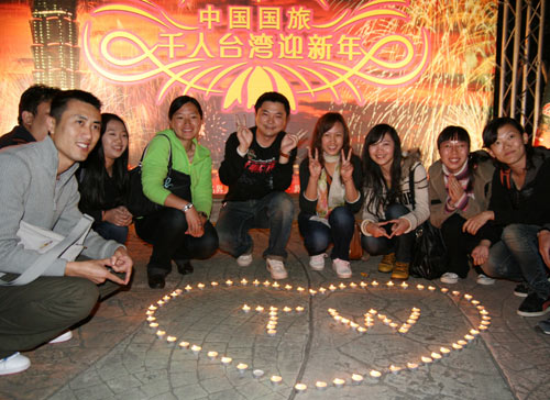由國旅集團組成的千人陸客團,29日在苗栗縣晚宴,部分團員用蠟燭排成中間具有“TW”字樣的愛心圖樣,歡喜迎接將在臺度過的跨年夜。