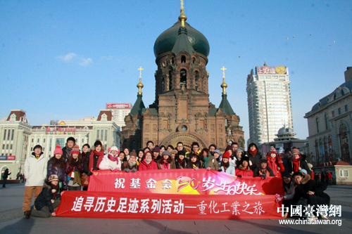 兩岸青年學子在哈爾濱圣索菲亞大教堂合影留念。(中國臺灣網 于斯文 攝)