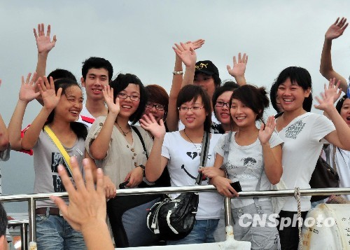 9月16日,起程赴臺(tái)就讀一年的福建23名在校大學(xué)生在福州馬尾登船后,向前來(lái)送行的家人和師生揮手告別。這是福州大學(xué)、福建師范大學(xué)等福建高校近200名赴臺(tái)學(xué)生中首批前往臺(tái)灣的學(xué)生,也是大陸率先成批次選派學(xué)生赴臺(tái)灣高校學(xué)習(xí)。中新社發(fā) 張麗君 攝