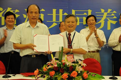 9月21日,福建省海洋學會代表(前排右)、福建省水產學會代表(前排左)與臺灣海洋大學代表(前排中)簽署《海峽兩岸海洋與漁業學術交流與合作意向書》。新華社記者 來建強 攝