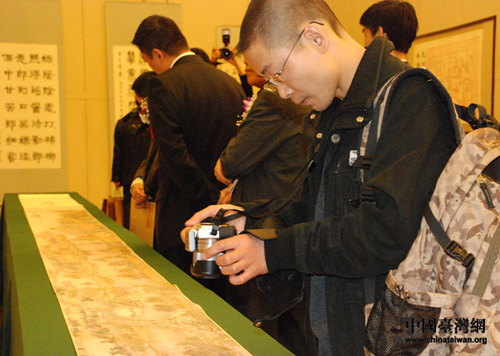 嘉賓們認真參觀現藏于臺北故宮博物院的清院本《清明上河圖》。(中國臺灣網 劉瑩 攝)