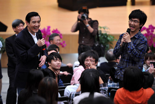馬英九(前左)15日在臺(tái)灣科技大學(xué)與學(xué)生座談時(shí),與來(lái)自大陸四川省的學(xué)生(右)對(duì)話。圖片來(lái)源:“中央社”