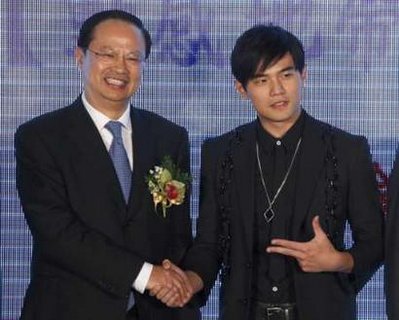 中移動總裁王建宙(左)與周杰倫(右)續簽動感地帶代言合同