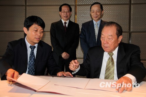 5月20日,在首度訪臺的海峽兩岸農業交流協會名譽會長危朝安(后排左)和臺灣二十一世紀基金會董事長高育仁見證下,雙方代表簽訂2010年合作備忘錄,將在年內合作舉辦“第二屆兩岸鄉村座談”等活動,深化兩岸農業、基層農民交流。 中新社發 董會峰 攝