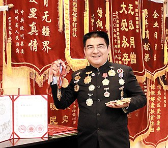 陳光標在辦公室展示歷年行善獲得的獎牌、徽章、證書等。圖片來源:臺灣聯(lián)合報