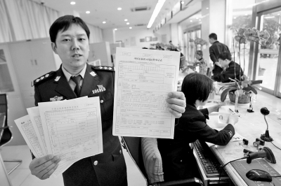 民警向記者展示以前辦理三類證件所需填寫(xiě)的三張表格(右手所拿)和今后需填寫(xiě)的表格(左手所拿)