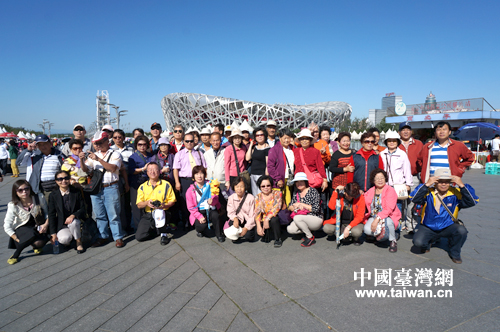 參訪團成員在鳥巢前合影留念。(中國臺灣網 王薇 攝)