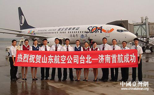 濟(jì)南臺(tái)北實(shí)現(xiàn)空中直航——濟(jì)南臺(tái)北首航機(jī)組返回濟(jì)南。圖片來(lái)源:濟(jì)南市臺(tái)辦