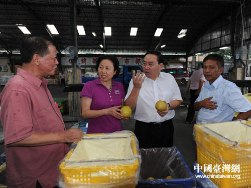 中共湖南省委副書記梅克保(左三)、湖南省人大常委會副主任劉蓮玉(左二)一行來到卓蘭鎮農會,現場考察水果儲藏包裝等工藝。(湖南省臺辦 李蘭 攝)