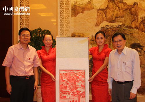 中國臺灣網9月20日棗莊消息 近日,蒞棗出席第三屆兩岸漢字藝術節歡迎宴會的臺灣中華文化總會會長劉兆玄與山東省棗莊市互贈禮品。 (中國臺灣網棗莊市臺辦通訊員 項允剛)