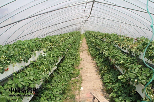 金龍門生態(tài)園草莓立體種植基地一棚。(黔南州臺辦張榮周、王斌 攝)