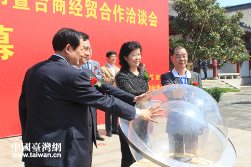 張雪燕與出席開幕式的領導同志和臺商代表共同按下水晶球。(圖片來源:泰安市臺辦)