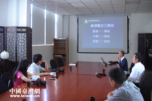 志工陳哲霖向記者介紹臺灣慈濟會對川援建情況。(德陽市臺辦 尹顯斌 攝)