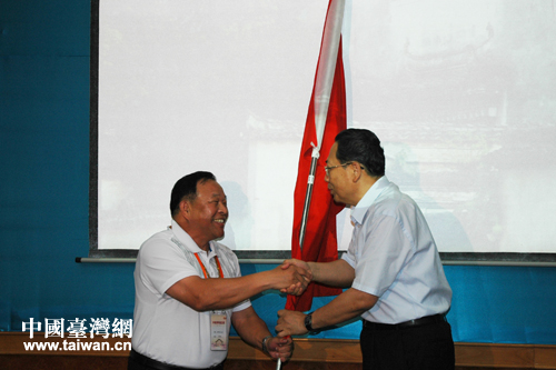 安徽省委副書記李錦斌向夏令營臺灣領(lǐng)隊老師授旗。(安徽省臺辦 裔淳 攝)
