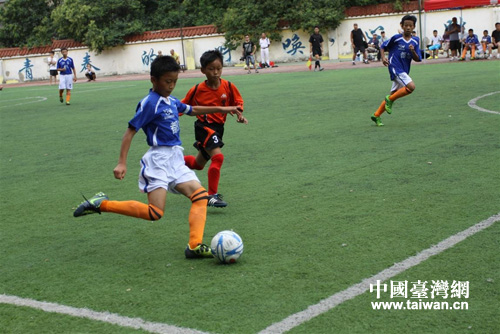 第六場,臺灣豐里小學少年足球隊與楊柳街小學少年足球隊爭奪第一名。(圖片來源:黔南州臺辦)