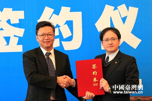 云南省政府副秘書長、省臺辦主任、省博覽局局長李極明(左)與臺灣貿易中心副秘書長王熙蒙互換簽約文本。(圖片來源:云南省臺辦)