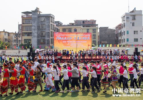 桂臺學子和著《我們都是一家人》的歡快樂曲跳起了多耶舞。(圖片來源:南寧市臺辦)