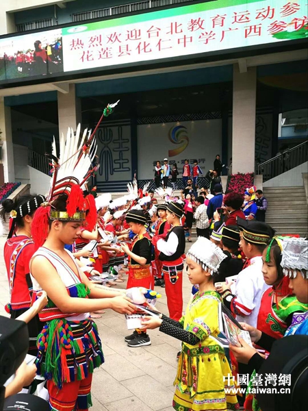 中國臺灣網4月18日南寧訊 “三月三”是壯族地區最為隆重的民族傳統節日和歌圩日。4月16日,臺北教育運動訪問團及臺灣花蓮縣化仁中學原舞隊一行65人到廣西南寧青秀區桂雅路小學開展“相約壯鄉三月三 民族團結一家親”桂臺校園民族文化交流活動。