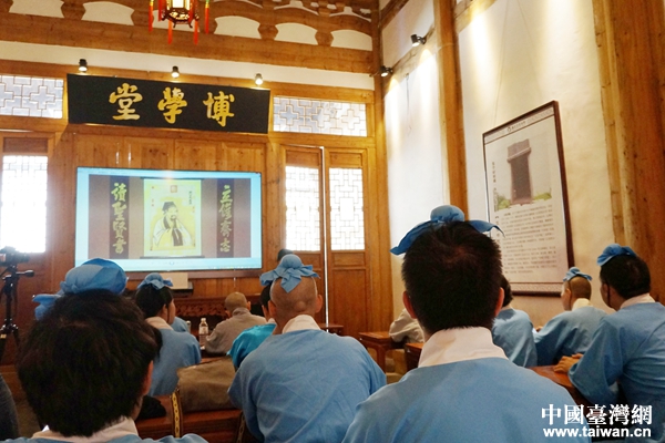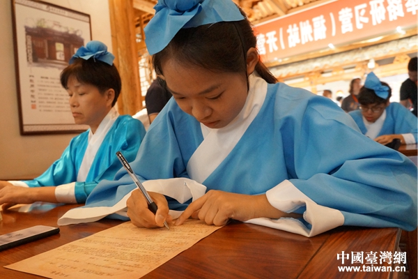 臺灣華梵大學、銘傳大學學生和在京青年臺胞大學生們以“士子”的身份,參加了此次考試,親身感受當年學子們勤奮讀書,報效國家的心路歷程,進一步了解科舉制度作為中國封建社會的制度支柱和文化主脈對臺灣產生的影響,更是對儒學文化有了深層次的認知。活動現場,研習營一行首先與福州市小朋友共同練習書寫毛筆字,體會中國書法之美感,接下來,學子們穿上統一的漢服,體驗當年正誼書院的“入學儀式”,并學習中華儒學禮儀,向朱子像行深衣禮,祭拜先賢。隨后,正誼書院楊瑞英老師為兩岸學子作了“兩岸書院文化源脈專題講座”。