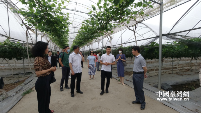 臺資農企負責人、農業(yè)專家在彭山區(qū)葡萄產業(yè)現(xiàn)代農業(yè)園區(qū)交流葡萄種植技術。(圖片來源:四川省臺辦)