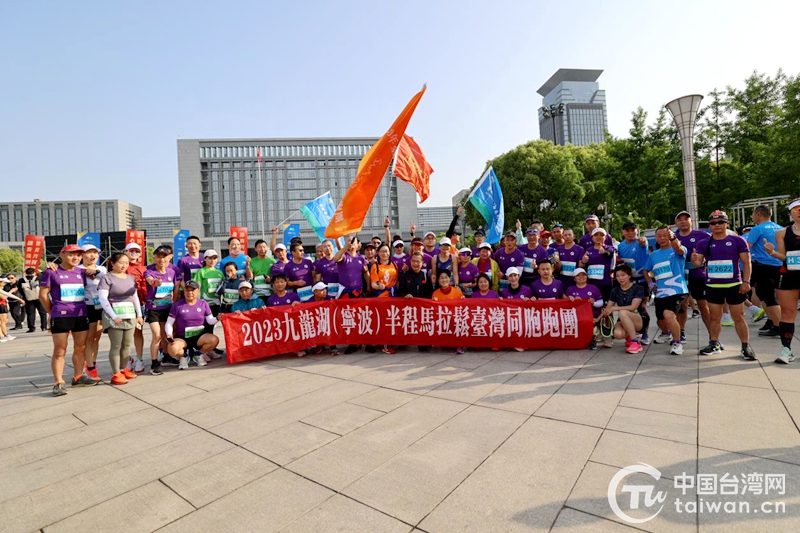 中國臺灣網4月25日訊 近日,2023九龍湖(寧波)半程馬拉松賽鳴槍開跑,來自臺灣南投縣和寧波鎮海區的50位跑友分別穿著的橘色隊服和紫色隊服,形成了一道靚麗的風景線。