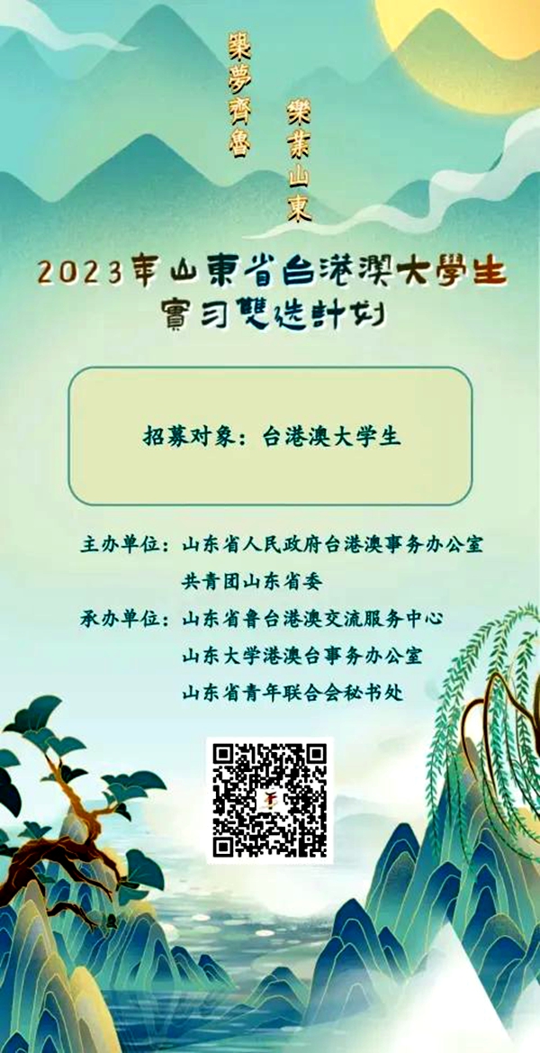 “2023山東省臺港澳大學生實習雙選計劃”由山東省政府臺港澳事務辦公室、山東大學、山東團省委主辦,山東省魯臺港澳交流服務中心、山東大學港澳臺事務辦公室、山東省青聯(lián)承辦,在山東省大型國有企業(yè)、民營企業(yè)、事業(yè)單位中征集常年有效實習崗位,全國各高校臺港澳大學生,特別是在魯就讀的臺港澳大學生,可通過掃描二維碼,進入實習雙選平臺,挑選適合自己的崗位開展實習。此次發(fā)布的195個崗位,80%以上提供食宿和實習補貼。
