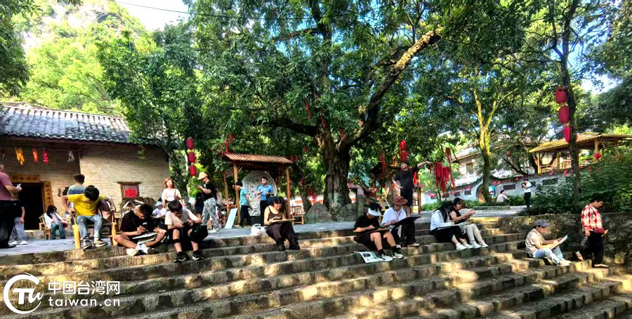 中國臺灣網8月25日訊 在廣西河池市都安瑤族自治縣東廟鄉天窗群的喀斯特峰叢小徑中,顏料與驕陽交相輝映,20余名兩岸書畫藝術家、青少年以筆墨為舟,將色彩在宣紙上暈染開來……