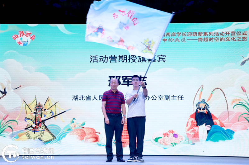 湖北省臺(tái)辦副主任邢軍志為兩岸學(xué)長(zhǎng)代表授旗。(中國(guó)臺(tái)灣網(wǎng)發(fā))