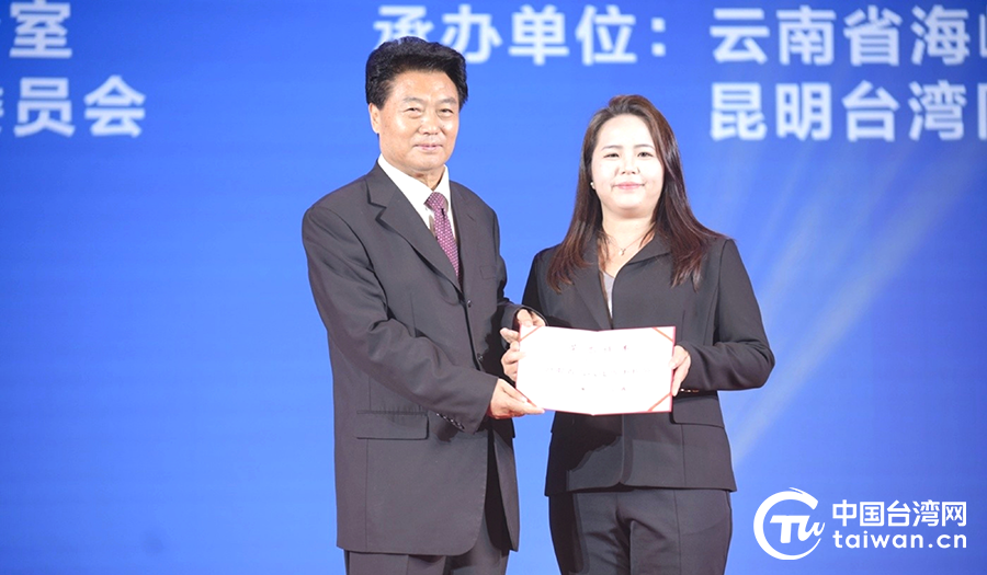 云南省政協副主席和良輝(左)為榮獲云南省三八紅旗手的臺灣青年頒發證書(中國臺灣網發)
