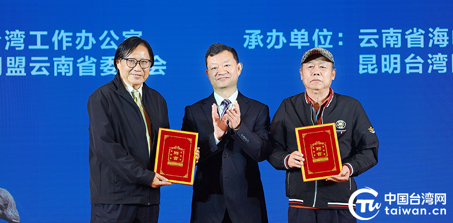 云南省委臺辦主任鄧恒源(中)頒發云臺兩地文化交流藝術顧問聘書(中國臺灣網發)