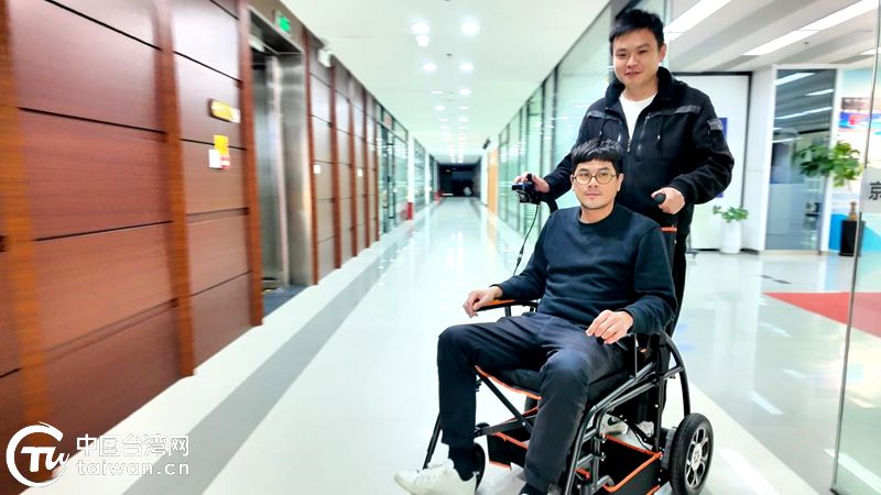 基地工作人員現(xiàn)場演示伴悅行電動雙人輪椅。(中國臺灣網(wǎng)發(fā))