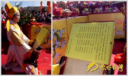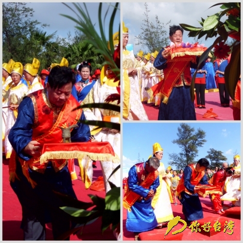 湄洲媽祖祖廟董事會董事長林金榜等三位主祭人率兩岸信眾,面朝大海,向媽祖神像行三跪九叩大禮。