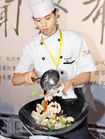 第二屆杭州美食文化節22日起至27日止在臺中市舉行,22日的品監會上,來自杭州的廚師,現場炒出一盤“荷塘小炒”,頓時菜香撲鼻,令人垂涎三尺。圖片來源:臺灣《中國時報》