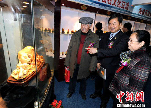 1月26日,來自海峽兩岸的2000名壽山石“石友”聚首福州進(jìn)行文化交流。當(dāng)日,由福州海峽兩岸和平統(tǒng)一促進(jìn)會、臺灣海峽兩岸和平統(tǒng)一促進(jìn)會等單位聯(lián)合主辦的2011海峽兩岸迎新春石友聯(lián)誼系列活動在福建藏天園藝術(shù)館開幕,為期24天的活動將舉辦“壽山石文化交流懇談會”、“兩岸石友鬧元霄”、“非物質(zhì)文化傳承人與石友交流”等活動。圖為臺灣“一國兩制”研究協(xié)會會長蔡武璋(右二)與福州海峽兩岸交流協(xié)會會長李純粹(右一)等嘉賓參加該聯(lián)誼活動。
