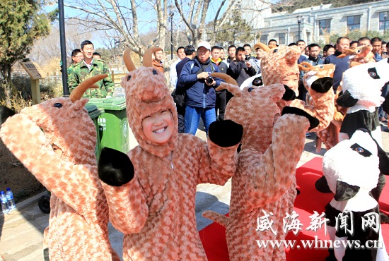 與此同時,在劉公島國家森林公園的廣場上,各有關部門負責人正在對歡迎儀式的流程進行推敲、演練,參加演出的鯨園小學的小學生們穿戴著梅花鹿、長鬃山羊、大熊貓造型的服裝在現場表演,參加活動的觀眾也在現場列隊演練。