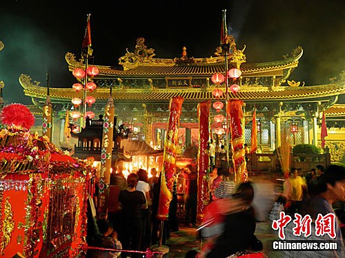 4月24日晚,廣東汕尾市城區(qū)中華媽祖文化節(jié)吸引了眾多潮汕地區(qū)、珠三角乃至港澳臺(tái)地區(qū)的香客前來朝拜媽祖。該活動(dòng)從24日開始,持續(xù)兩天。活動(dòng)除祭拜媽祖外,舉行一系列具有潮汕文化的傳統(tǒng)節(jié)目,如西秦戲、汕尾漁歌等表演,以及大潮汕地區(qū)燈謎活動(dòng)等,為從海外、港澳臺(tái)歸來的“游子”展示出了家鄉(xiāng)新貌。中新社發(fā) 陳世勇 攝